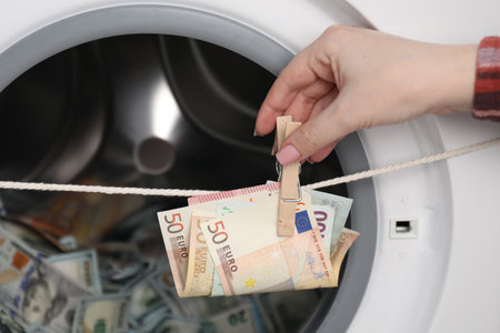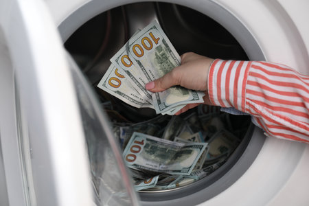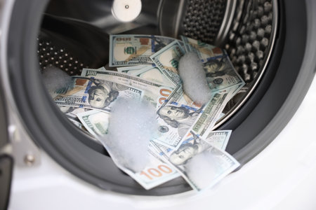 Dollar bills inside a washing machine, a metaphor for money laundering
