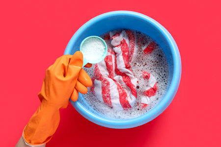 Woman in rubber gloves adding laundry detergent to clothes in plastic basin on red background