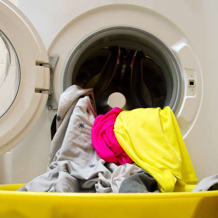 Basket of dirty clothes in the laundry with kind of a washing machines, washing house