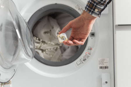 Close-up of unrecognizable man holding two laundry detergent pods preparing to load washing machine with clothes for fresh and clean laundry. Concept of cleanliness and housekeeping.