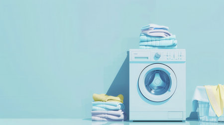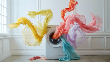 Modern washing machine with colorful flying fabrics coming out of it, suggesting a concept of efficient laundry and clean fresh clothes