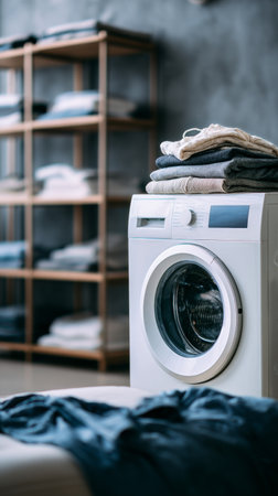 A modern laundry room features a washing machine next to a wooden shelf stacked with clean, folded towels. Soft daylight filters through, highlighting the organized space.