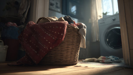 A close-up of a wicker basket with a pile of clothes, waiting for laundry day, placed in a cozy laundry nook with soft lighting.