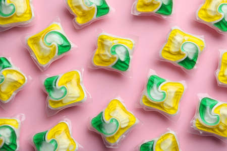 Many dishwasher detergent pods on pink background, flat lay. Space for text
