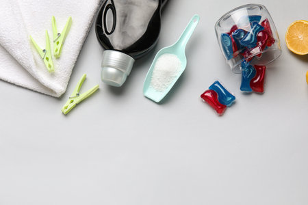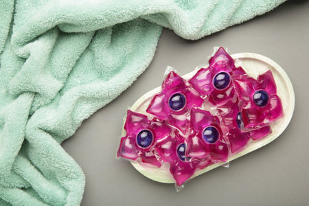 Laundry capsules with mint towel on gray background. Laundry detergent for washing clothes in a washing machine. Top view