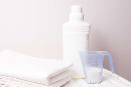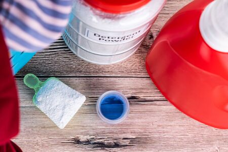 Laundry detergent bottles and clothes on the table. Household chemicals