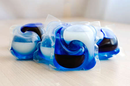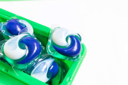 Washing powders in multi-colored capsules are in a blue plastic box. The concept of washing and cleanliness