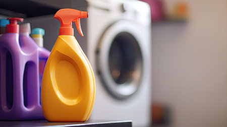 A vibrant yellow spray bottle of cleaning solution sits prominently in a stylish laundry room, showcasing modern cleaning essentials and efficient home care.