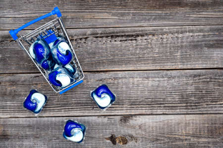 A lot of three-in-one gel capsules for wash in a washing machine in the shopping cart on a gray wooden table background. Concept laundry cleaning service. Copy space, top view.