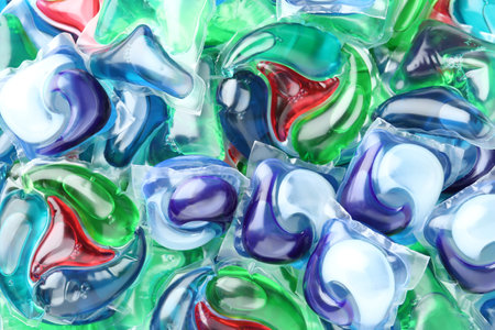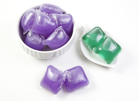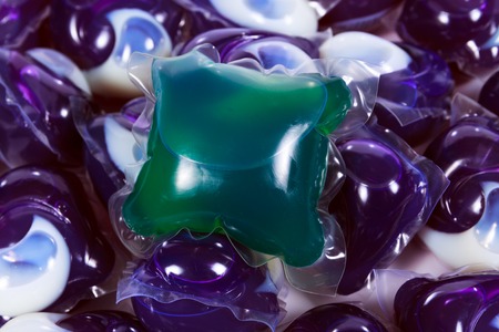Dishwasher detergent capsules and or laundry soap close-up background.