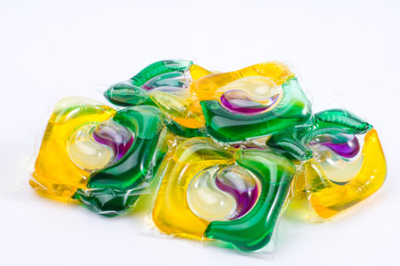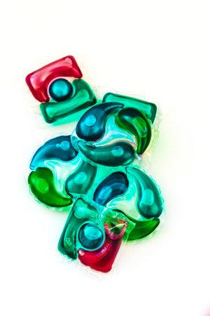 washing pods on white background, close up, abstract color background.liquid detergent,capsules with colored gel.3 in 1 laundry detergent pod. Economic and environment friendly for clothes washing
