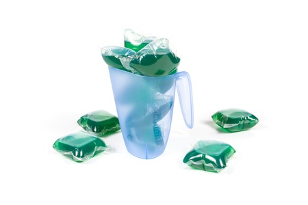 Washing gel capsule pod with laundry detergent isolated on white background.