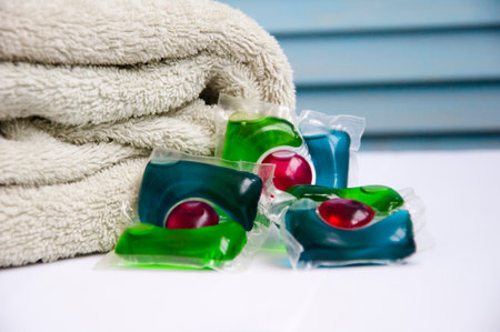 Laundry capsules. Laundry gel in capsules and towels close-up.