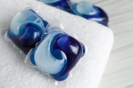 detergent pods at towel. minimalism of detergent. laundry detergent.