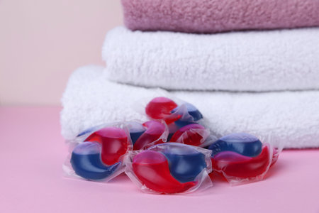 Laundry detergent capsules and clean towel on pink background, closeup