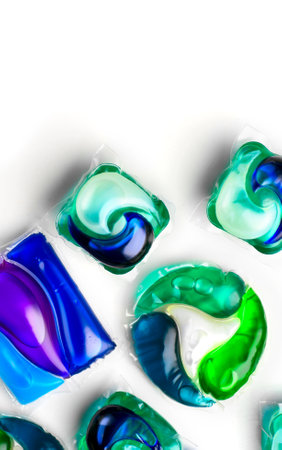 Capsules for washing clothes isolated on white background. Housework concept. Washing and clean things. Top view. flat lay composition.