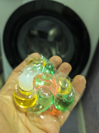 Woman holding a washing capsule for colored clothes, laundry powders and gels focus on removing tough stains.