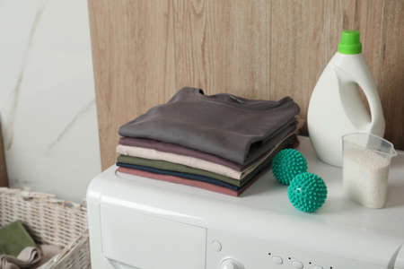 Dryer balls, stacked clean clothes and detergents on washing machine