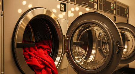Close up view of two commercial washing machines in a laundromat, one with red laundry inside and both doors open, ready for washing or drying.