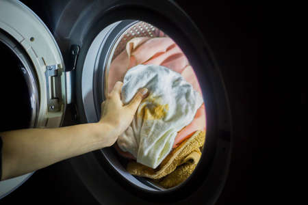 Hands to load the Laundry in the washing machine at the dry cleaners.