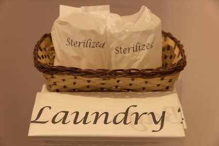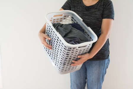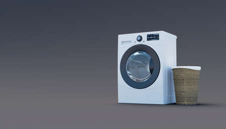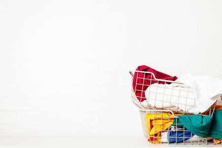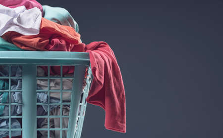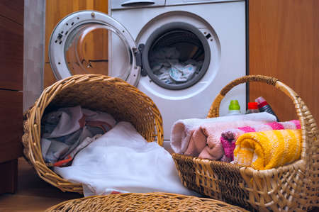 Basket of dirty clothes in the laundry with kind of a washing machines, washing house