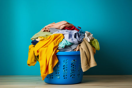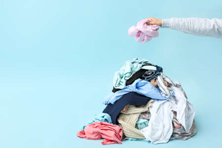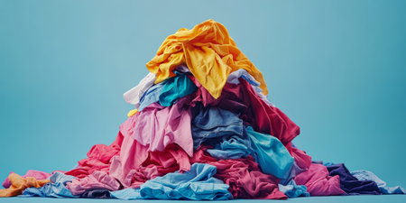 A vibrant pile of assorted crumpled clothes in various bold and bright colors is situated against a pleasing blue backdrop, skillfully showcasing the chaotic nature of a typical laundry day