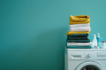 A stack of neatly folded laundry sits atop a white washing machine in a teal-colored room.
