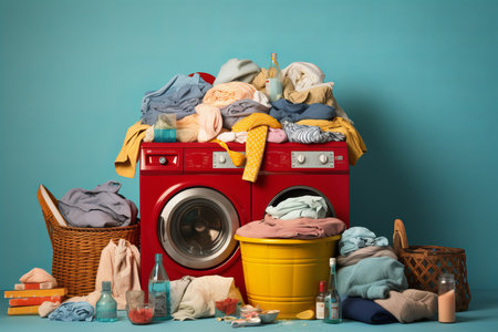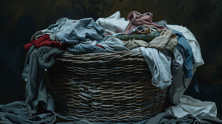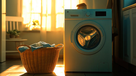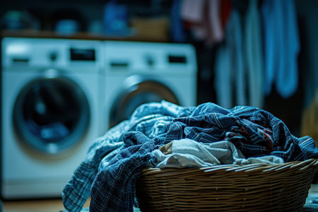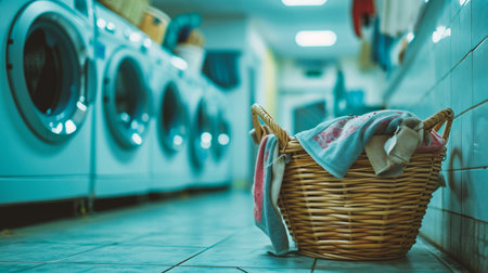 A laundry basket overflows with assorted clothes, showcasing various fabrics and colors. In the background, two washing machines hum quietly, creating a warm, homely atmosphere during the evening.