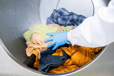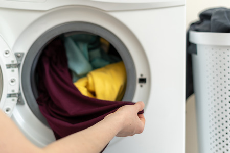 Woman's hand putting colorful laundry into an industrial washer of a dry cleaner