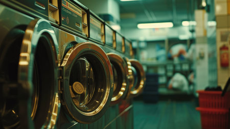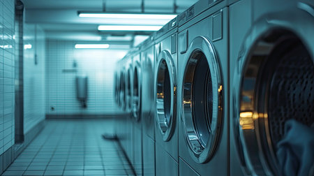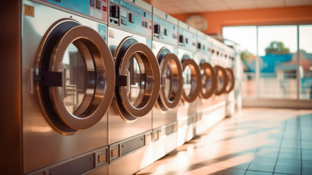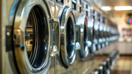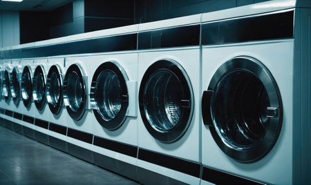 A row of washing machines in a laundromat, ready for a busy day of cleaning clothes