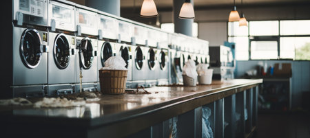 Modern bright laundromat with minimalist design. Chic laundromat aesthetic. Concept of stylish laundry facilities, contemporary decor, and inviting atmosphere.