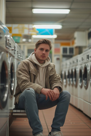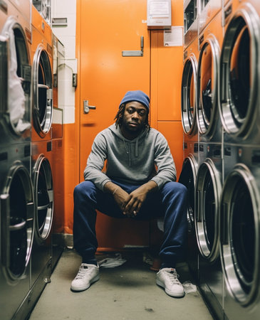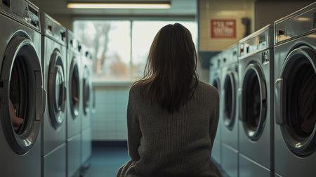 A woman seated quietly in a laundromat, surrounded by washing machines during the late afternoon hour