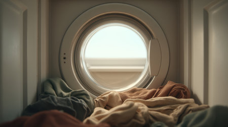A captivating interior view of a washing machine drum filled with colorful clothes. The soft light streaming through the circular door adds warmth to the scene.