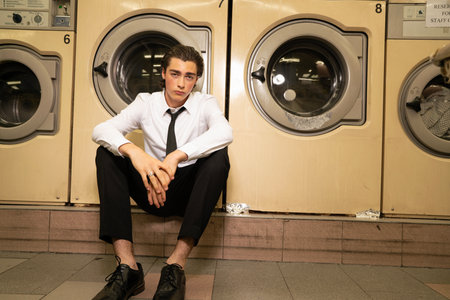 A modern laundry room featuring two front-loading washing machines, a pile of black, white, and red clothes on the floor, and dramatic light and shadow effects.