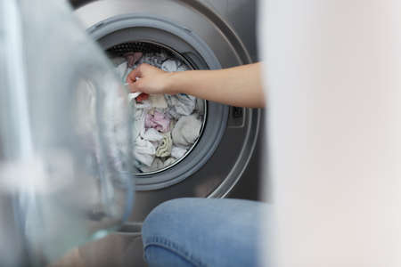 Woman pulling out clean clothes from washing machine in bathroom closeup