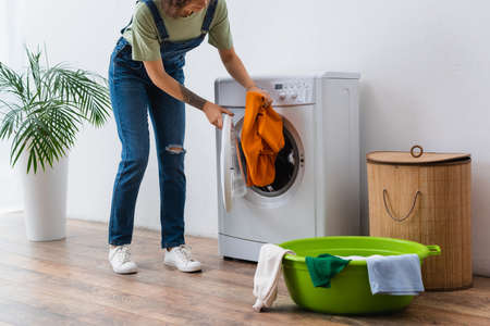 cropped view of housewife putting clothes into washing machine near laundry bowl and basket