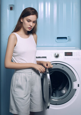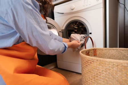 A woman takes clean laundry from the washing machine, fresh clothes in a basket, fabric fresheners for lasting freshness.