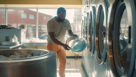 Photo of surprised dark skinned man sticks head in washing machine door poses around colorful laundry with bottle of detergent wears panama busy doing washing Washer full : Generative AI