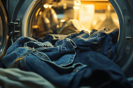 Closeup of a washing machine loaded with dirty jeans and various denim garments indoors
