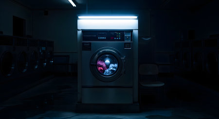 A single, front-loading washing machine is illuminated by a stark, cool fluorescent light in a dark, empty laundromat at night. Colorful clothes are visible spinning inside, creating a focal point in the moody and cinematic scene.