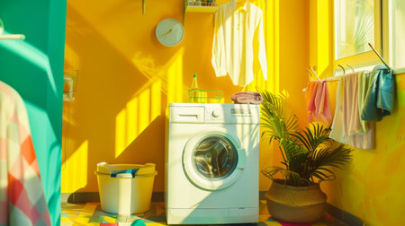 A colorful laundry room with a front-loading washing machine and vibrant decor, creating a cheerful atmosphere