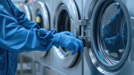 A person in blue gloves is adjusting a washing machine in a clean, well-lit laundry facility. The activity showcases the process of laundering clothes efficiently.