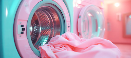 Two vibrant laundry machines stand in a stylish laundromat, one with a pink shirt partially emerging from the door. The bright colors create a cheerful atmosphere for laundry chores.