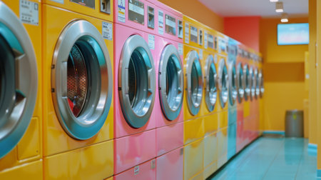 Public laundromat with neon lights and sleek washing machines. High-tech laundry facility. Concept of technology, efficiency