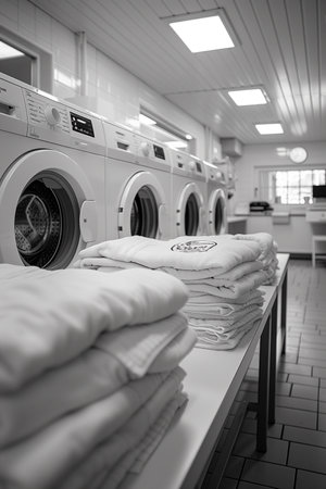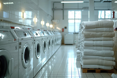 In a brightly lit, sterile facility, a long row of industrial washing machines stands ready for the next cycle. In the foreground, perfectly folded stacks of crisp, white linens await distribution, symbolizing the peak of professional cleanliness and operational efficiency for the hospitality or healthcare industry.