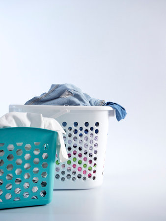 Pile of dirty, colorful laundry in baskets.