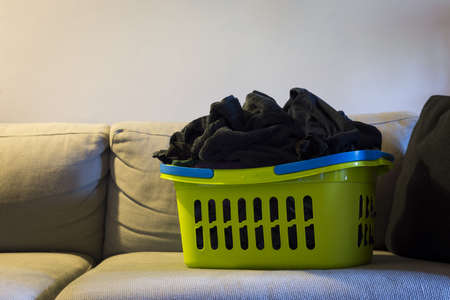 green laundry clothes basket standing couch