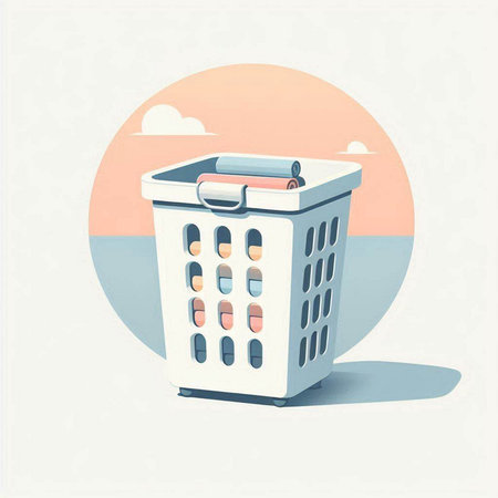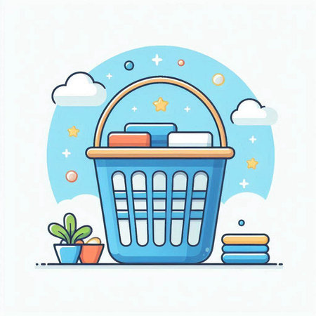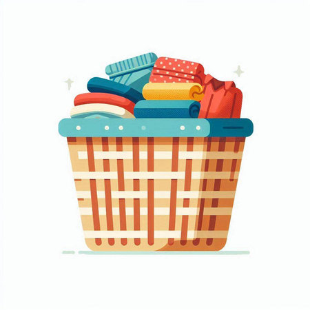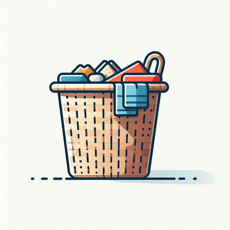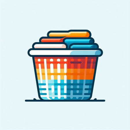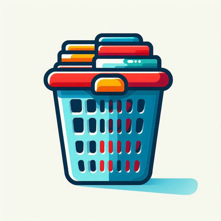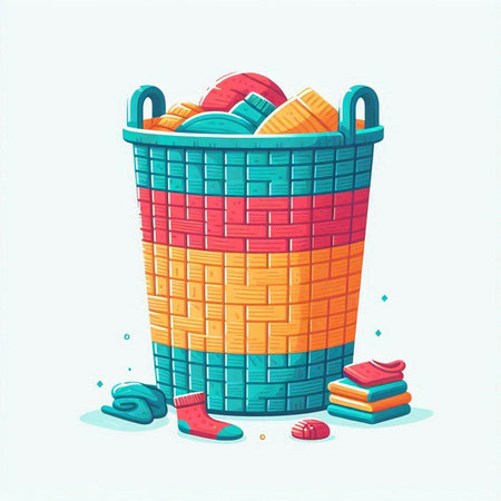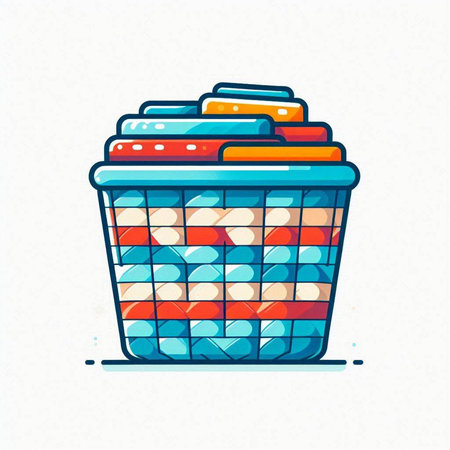 Illustration of a plastic basket full of clothes on a white background