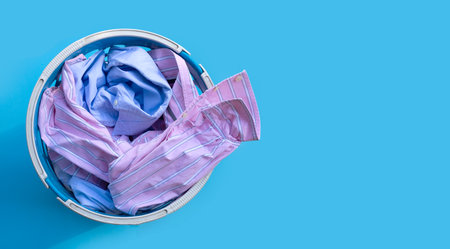Clothes in a laundry basket on blue