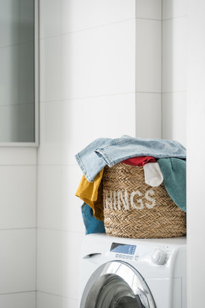 full wicker basket with unwashed color apparel and terry towel on automatic washing machine in apartment bathroom with white tiled wall, housework concept